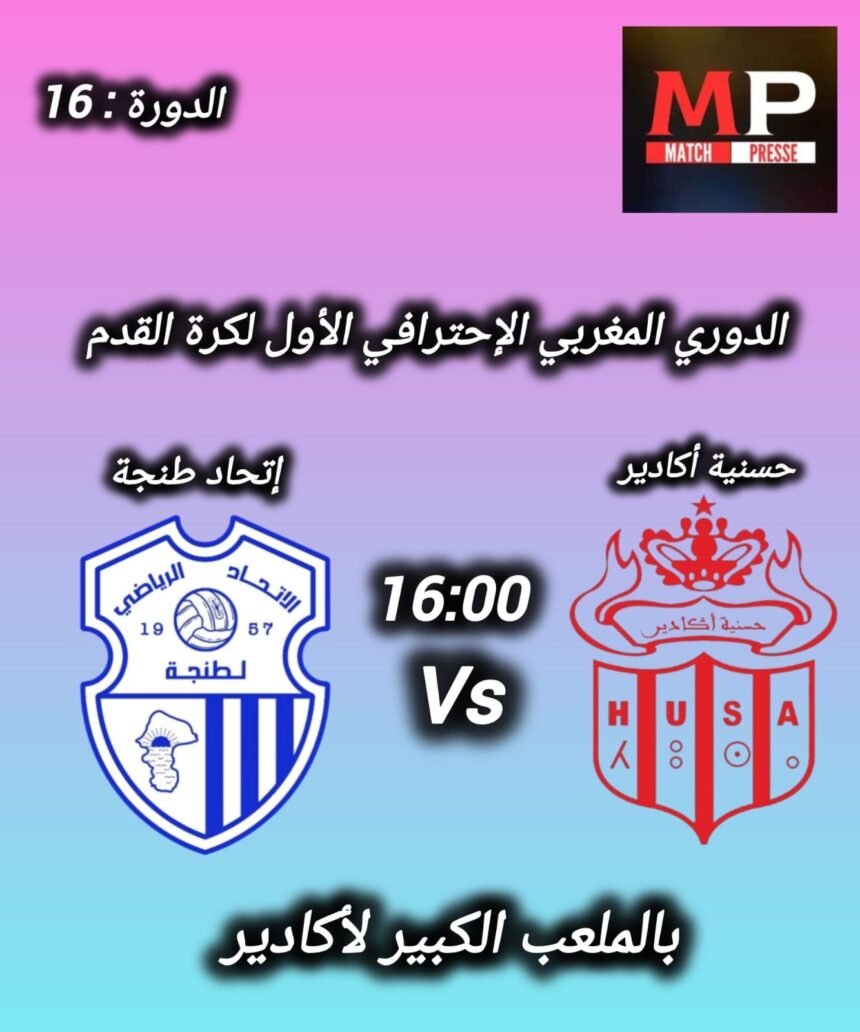 تعيش مدينة أكادير مساء السبت 25 أبريل 2026 على وقع مواجهة مشتعلة لا تقبل أنصاف الحلول حين يستقبل فريق حسنية أكادير ضيفه اتحاد طنجة على أرضية الملعب الكبير انطلاقًا من الساعة الرابعة عصرًا برسم الجولة 16 من الدوري المغربي الاحترافي الأول لكرة القدم.