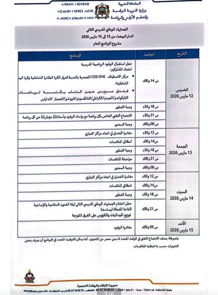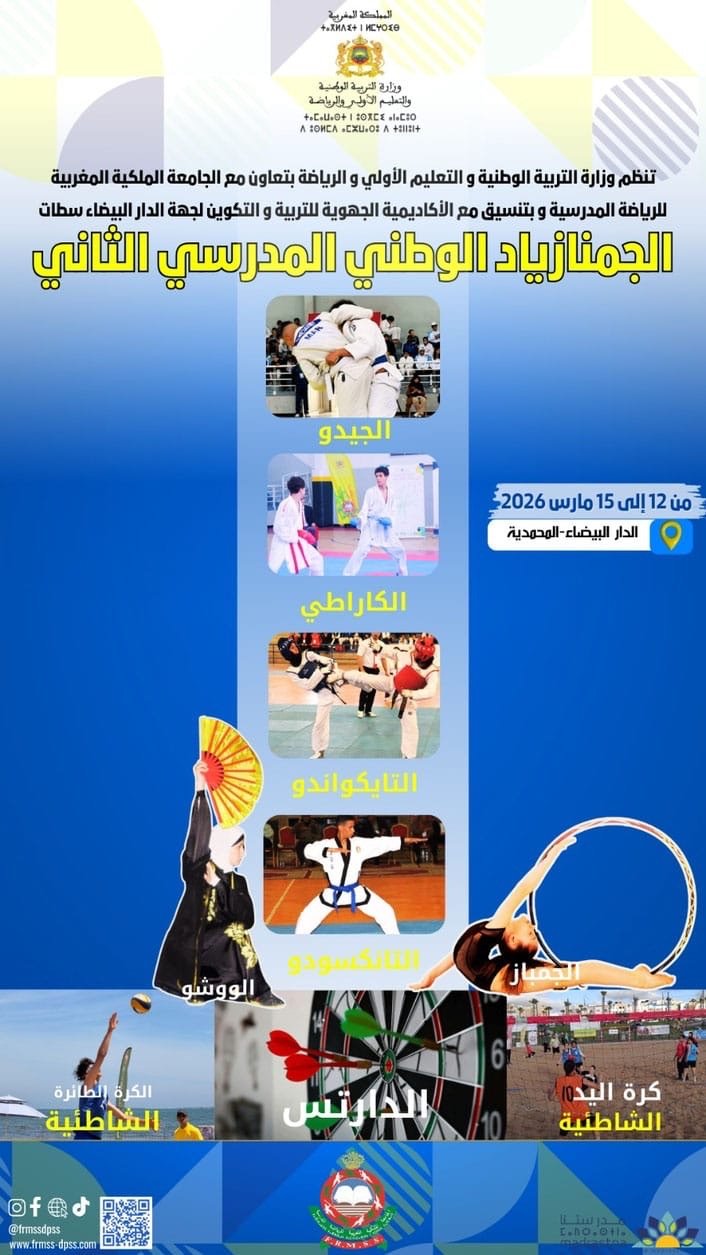 تستعد مدينتا الدار البيضاء والمحمدية لاحتضان فعاليات الجيمنازياد الوطني المدرسي الثاني برسم الموسم الدراسي 2025-2026، وذلك خلال الفترة الممتدة من 12 إلى 15 مارس 2026، في تظاهرة رياضية تربوية كبرى تجمع نخبة التلميذات والتلاميذ المتميزين في مختلف الرياضات المدرسية من جهات المملكة.