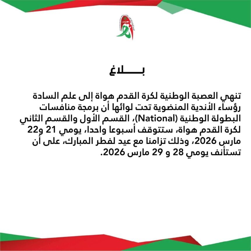 وأوضح البلاغ أن مباريات القسمين الأول والثاني من بطولة البطولة الوطنية للهواة ستتوقف يومي 21 و22 مارس 2026، على أن تُستأنف المنافسات من جديد يومي 28 و29 مارس 2026.