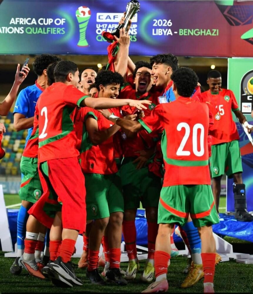 فرحة اشبال الاطلس بالتتويج بكأس بطولة شمال افريقيا لكرة القدم لأقل من 17 سنة بعد الفوز الرابع على التوالي وتحقيق العلامة الكاملة ضد منتخب ليبيا صاحب الارض والجمهور بنتيجة (1\3) على ارضية ملعب بنغازي بليبيا