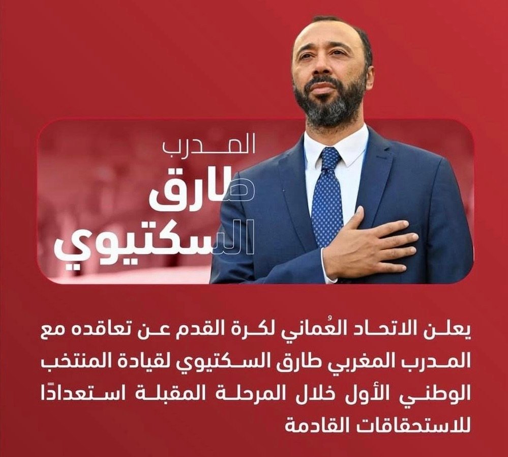 أعلن الاتحاد العُماني لكرة القدم، بشكل رسمي، تعاقده مع الإطار الوطني المغربي طارق السكتيوي، للإشراف على تدريب المنتخب الأول، وذلك في إطار الاستعداد للاستحقاقات الكروية المقبلة.