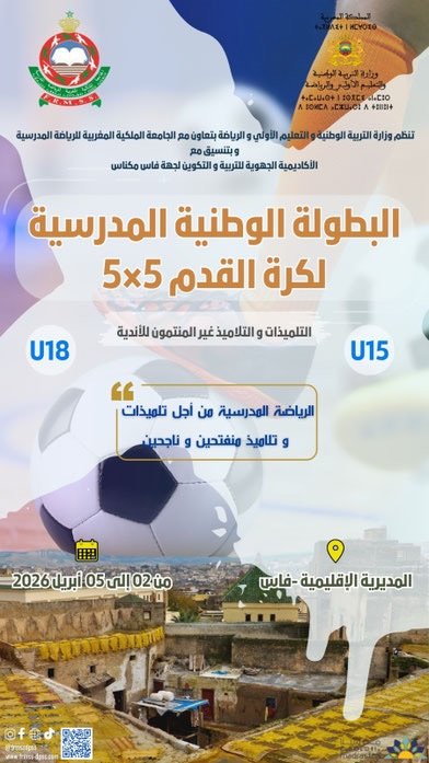 تنظم وزارة التربية الوطنية والتعليم الأولي والرياضة ، بتعاون مع الجامعة الملكية المغربية للرياضة المدرسية والأكاديمية الجهوية للتربية والتكوين لجهة فاس-مكناس ، نهائيات البطولة الوطنية المدرسية لكرة القدم 5X5 لفائدة التلميذات والتلاميذ غير المنتمين للأندية الرياضية بمدينة فاس خلال الفترة الممتدة من 2 إلى 5 أبريل 2026.