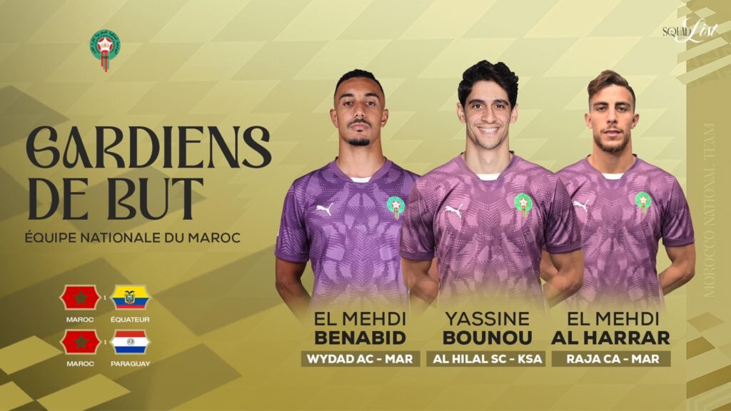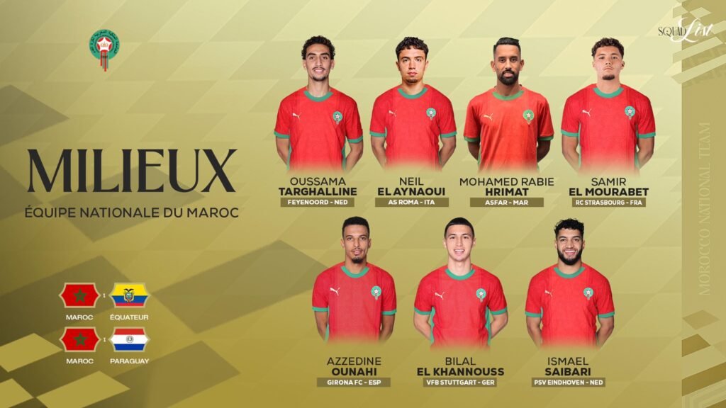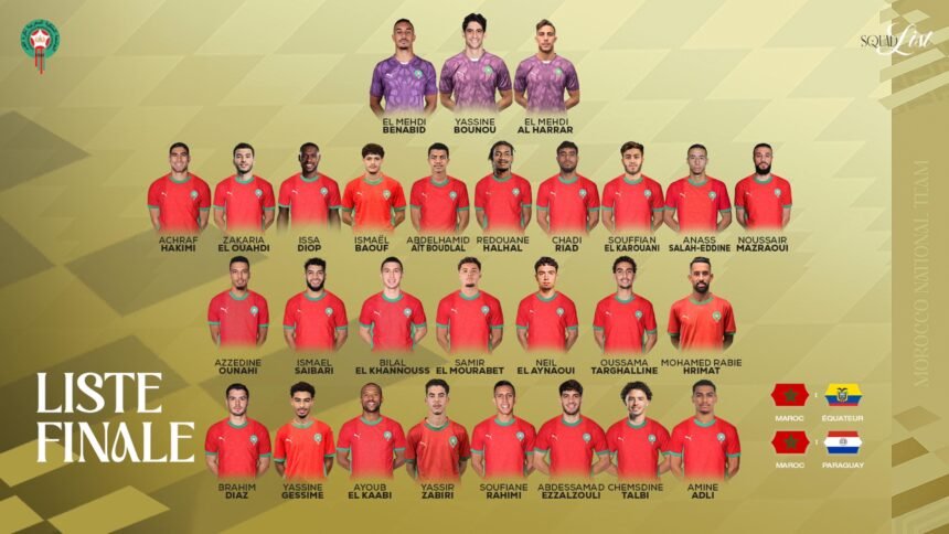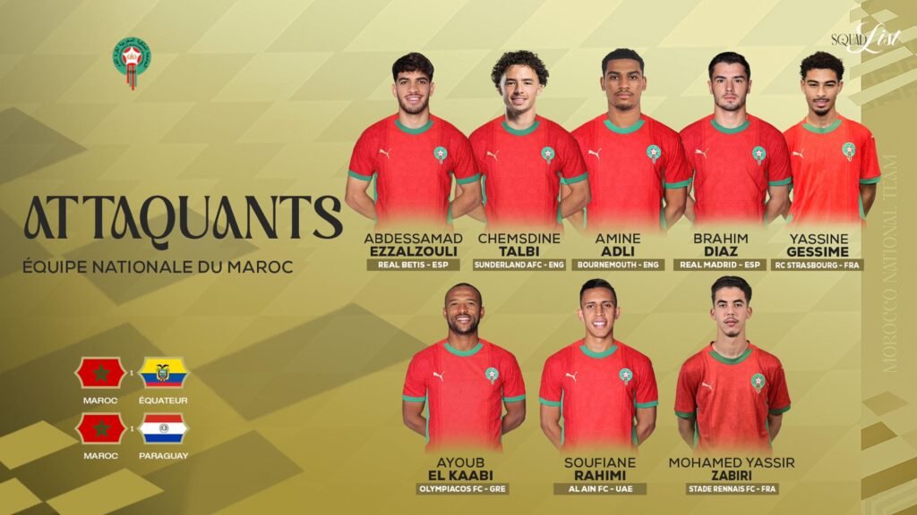 وشهدت القائمة حضور مزيج من اللاعبين أصحاب الخبرة والعناصر الصاعدة، مقابل غيابات بارزة لأسباب مختلفة، أبرزها إصابة نايف أكرد، إلى جانب غيابات تقنية لكل من يوسف النصيري، سفيان المرابط وإلياس بنصغير.