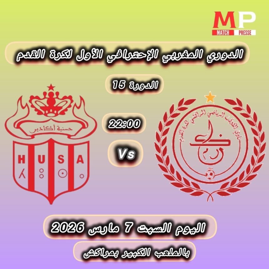 يحتضن الملعب الكبير بمراكش مساء اليوم السبت 7 مارس 2026 مواجهة مهمة تجمع الكوكب المراكشي بضيفه حسنية أكادير برسم الجولة الخامسة عشرة من الدوري المغربي الاحترافي الأول لكرة القدم في مباراة يرفع فيها الفريقان شعار البحث عن النقاط الثلاث من أجل تحسين وضعيتهما في جدول الترتيب