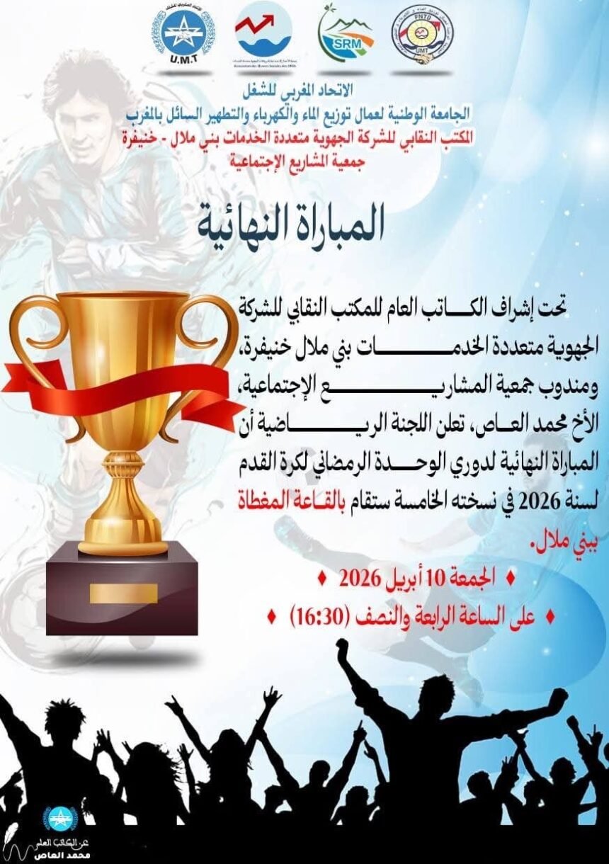 تستعد مدينة بني ملال لاحتضان حدث رياضي مميز، يتمثل في المباراة النهائية لدوري “الوحدة الرمضاني” لكرة القدم لسنة 2026 في نسخته الخامسة، والذي تنظمه كل من الجامعة الوطنية لعمال توزيع الماء والكهرباء وتطهير السائل بالمغرب، والمكتب النقابي للشركة الجهوية متعددة الخدمات بني ملال خنيفرة، إلى جانب جمعية المشاريع الاجتماعية.