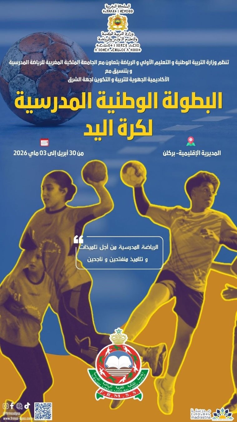 تنظم وزارة التربية الوطنية والتعليم الأولي والرياضة ، بشراكة مع الجامعة الملكية المغربية للرياضة المدرسية ، وبتنسيق مع الأكاديمية تنظم وزارة التربية الوطنية والتعليم الأولي والرياضة ، بشراكة مع الجامعة الملكية المغربية للرياضة المدرسية ، وبتنسيق مع الأكاديمية الجهوية للتربية والتكوين لجهة الشرق ، البطولة الوطنية المدرسية لكرة اليد ، وذلك خلال الفترة الممتدة من 30 أبريل إلى 03 ماي 2026 بكل من السعيدية وبركان ، بمشاركة واسعة لتلميذات وتلاميذ المؤسسات التعليمية يمثلون مختلف جهات المملكة.
