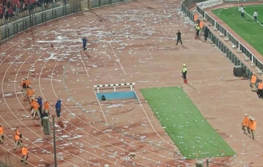 وعرفت المباراة أجواء مشحونة بعد رمي قنينات المياه بكثافة باتجاه أرضية الملعب ومحيط المدرجات، وهو ما تسبب في ارتباك واضح وأجبر طاقم التحكيم على توقيف اللعب أكثر من مرة حفاظاً على سلامة اللاعبين والجماهير.