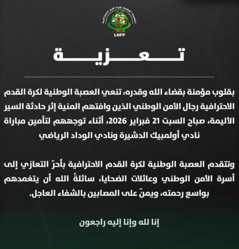 نعت العصبة الوطنية لكرة القدم الاحترافية صباح اليوم السبت، 21 فبراير 2026، أربعة من عناصر الأمن الوطني الذين لقوا مصرعهم في حادثة سير مأساوية أثناء توجههم لتأمين المباراة التي كانت ستجمع بين أولمبيك الدشيرة والوداد الرياضي.