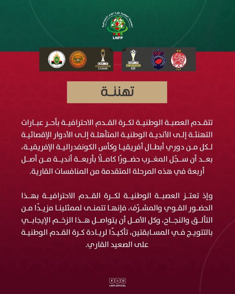 أشادت العصبة الوطنية لكرة القدم الاحترافية بالمستوى الذي قدمته الأندية المغربية في المنافسات الإفريقية خلال الموسم الحالي، بعد تمكنها من تجاوز دور المجموعات وحجز مقاعدها في الأدوار النهائية من بطولتي دوري الأبطال وكأس الكونفدرالية.