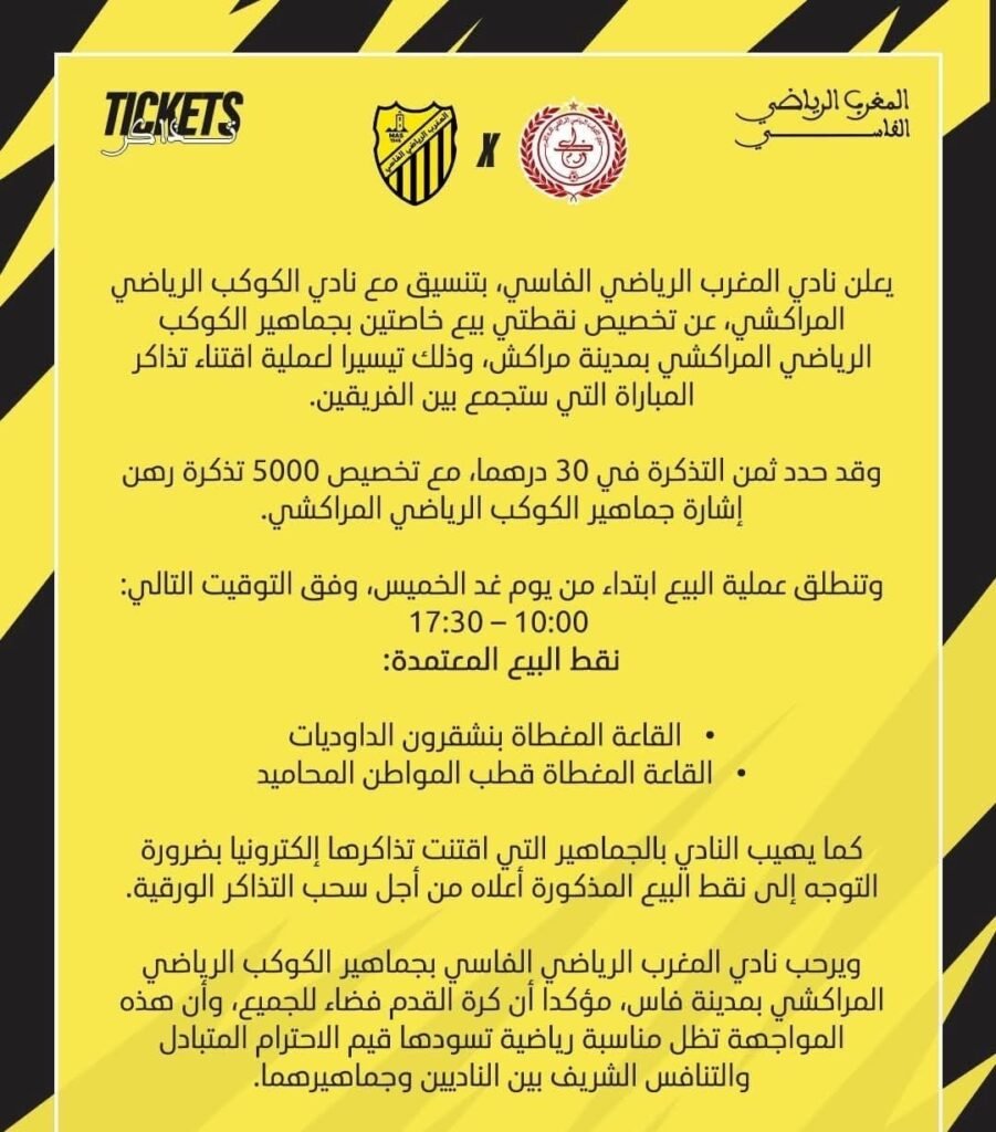 كما دعت إدارة الفريق الفاسي الجماهير التي اقتنت تذاكرها عبر الإنترنت إلى استلام النسخ الورقية من نقاط البيع المحددة، تفاديًا لأي ارتباك يوم المباراة. واختتم البلاغ برسالة ترحيب بأنصار “الكويكا”، مع التأكيد على أن اللقاء يجب أن يمر في أجواء يسودها الاحترام والتنافس النزيه، بما يليق بتاريخ الناديين وجماهيرهما.