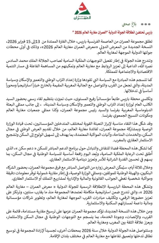في بلاغ صحفي توصل به موقع ماتش بريس، أعلنت مجموعة العمران عن إطلاق النسخة الجديدة من المعرض الدولي «معرض العمران – مغاربة العالم 2026»، وذلك من العاصمة الفرنسية باريس خلال الفترة الممتدة من 13 إلى 15 فبراير 2026، في أولى محطات جولتها الدولية الموجهة لمغاربة العالم