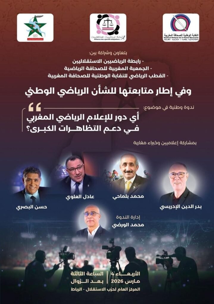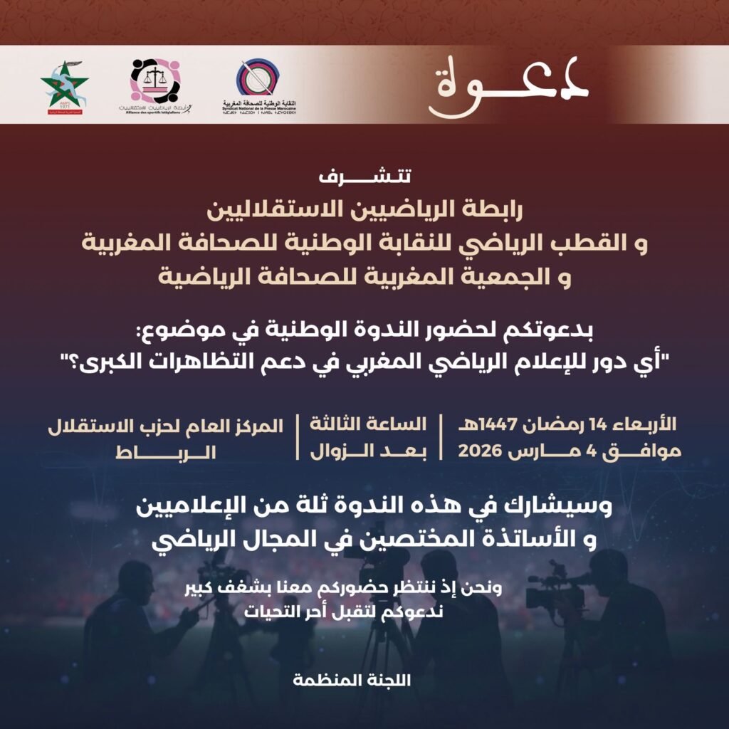 تستعد مدينة الرباط لاحتضان ندوة وطنية بارزة يوم الأربعاء 4 مارس 2026، حول موضوع: “أي دور للإعلام الرياضي الوطني في دعم التظاهرات الرياضية الكبرى؟”، بالمركز العام لحزب الاستقلال، بمبادرة مشتركة من: