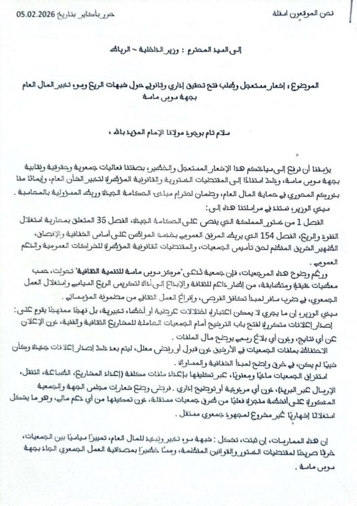 وبحسب مضمون المراسلة، فإن جمعية تُدعى “مركز سوس ماسة للتنمية الثقافية” أصبحت محل تساؤلات متزايدة، على خلفية تكرار إعلانات فتح باب الترشيح أمام الجمعيات الحاملة لمشاريع ثقافية وفنية، دون نشر نتائج واضحة أو تقديم توضيحات رسمية بشأن مآل الملفات السابقة.