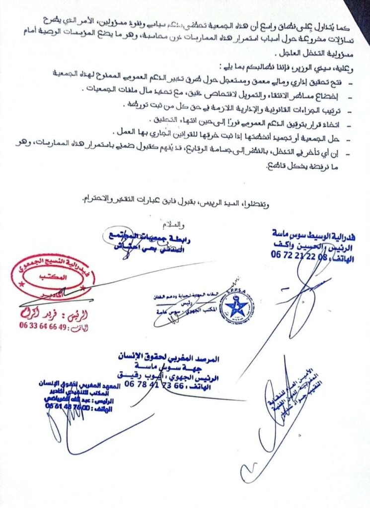 المراسلة تضمنت كذلك دعوة صريحة إلى إخضاع مساطر الانتقاء والتمويل لافتحاص دقيق، مع تحديد المسؤوليات وترتيب الجزاءات القانونية في حال ثبوت أي خروقات، إلى جانب المطالبة بتعليق الدعم العمومي المرتبط بالجمعية موضوع الجدل إلى حين انتهاء التحقيق.