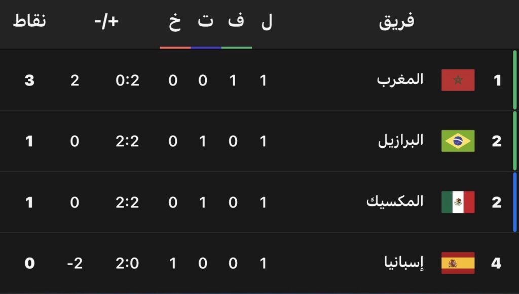 وهكذا، وبعد انتهاء الجولة الأولى، تبوَّأ “أشبال الأطلس” قمة المجموعة الثالثة برصيد ثلاث نقاط، في حين احتلت البرازيل والمكسيك المركزين الثاني والثالث بنقطة لكل منهما، وتذيل المنتخب الإسباني القائمة بدون رصيد من النقاط.