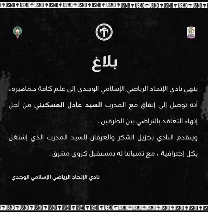 تقدمت إدارة النادي بالشكر الجزيل للمدرب السابق عادل المسكيني على جهوده المبذولة خلال الفترة الماضية، متمنية له مسيرة تدريبية ناجحة ومستقبل كروي مشرق. وأكدت الإدارة أن القرار تم بالتراضي وبروح رياضية عالية، مع الحفاظ على الروح المعنوية للفريق.
