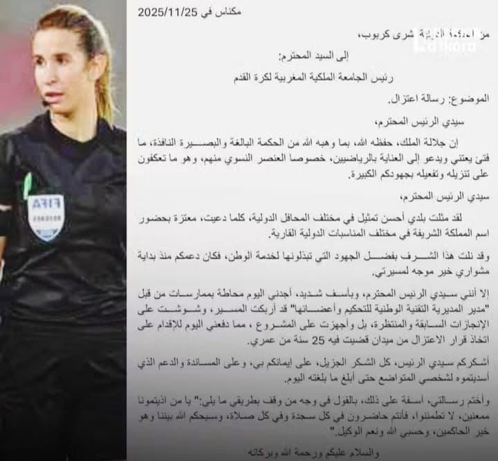 بعثت الحكمة الدولية المغربية بشرى كربوبي رسالة رسمية إلى فوزي لقجع، رئيس الجامعة الملكية المغربية لكرة القدم، تُعلن فيها قرارها اعتزال مجال التحكيم بعد مسيرة دامت 25 سنة، مؤكدة أن دوافع القرار ترتبط بما وصفته بـ“ممارسات أربكت المسار وشوّشت على الإنجازات”.