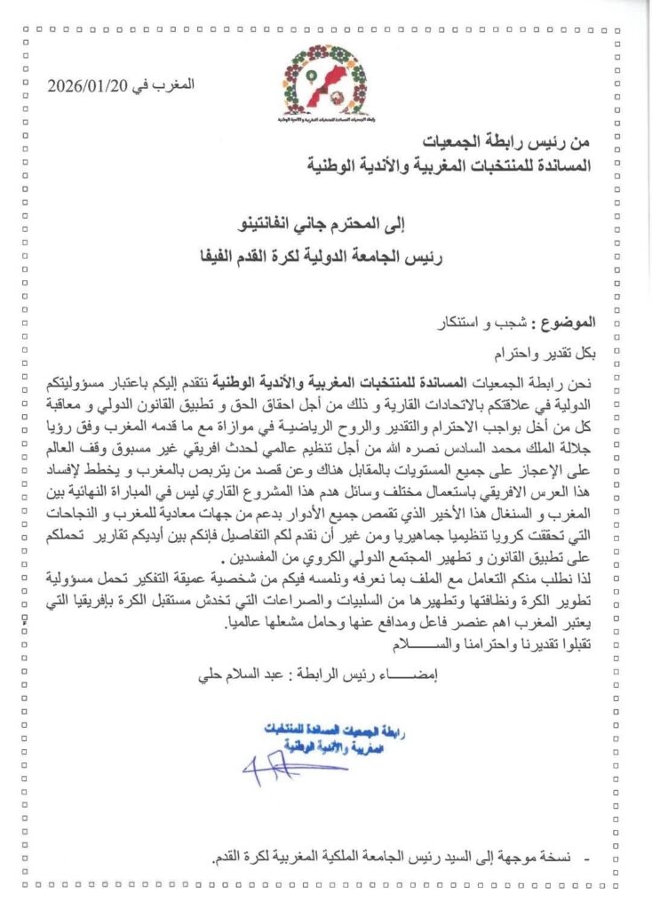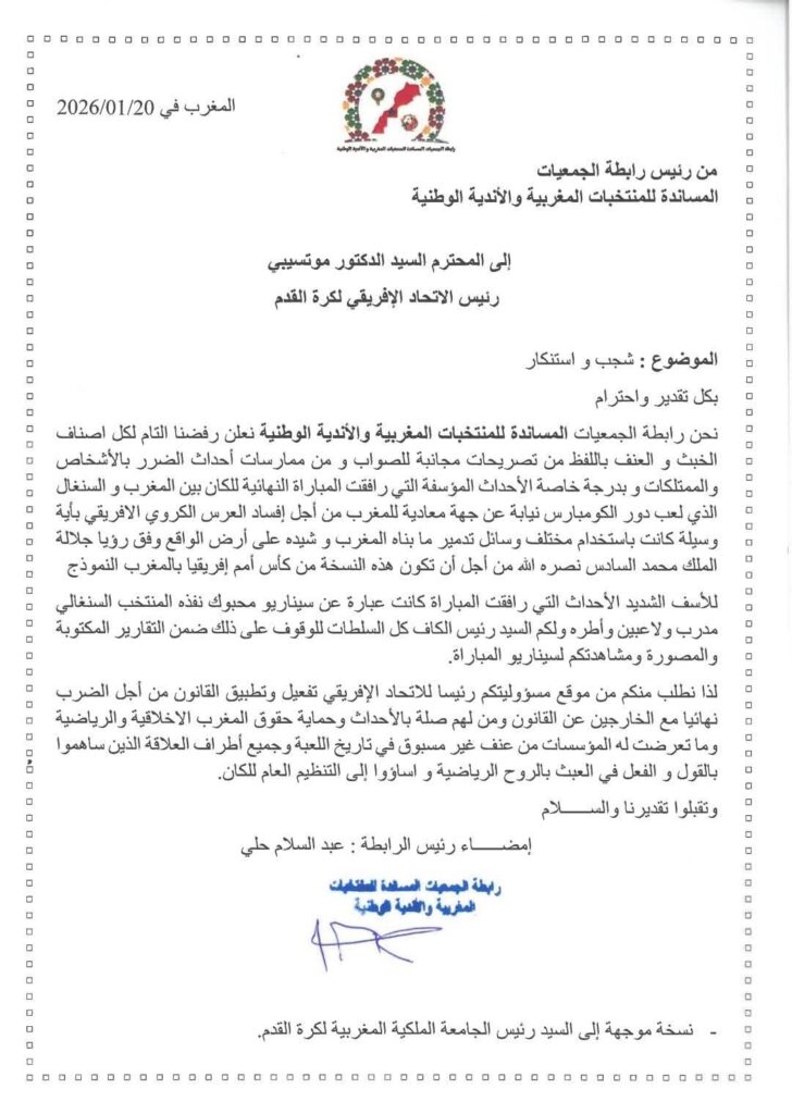 دخلت رابطة الجمعيات المساندة للمنتخبات المغربية والأندية الوطنية على خط الجدل القاري والدولي، على خلفية الأحداث التي رافقت المباراة النهائية القارية بين المغرب والسنغال، حيث وجهت مراسلتين رسميتين إلى كل من رئيس الاتحاد الإفريقي لكرة القدم (الكاف) ورئيس الاتحاد الدولي لكرة القدم (فيفا)، عبّرت فيهما عن شجبها واستنكارها لما وصفته بتجاوزات خطيرة تمس بروح اللعبة ومبادئ العدالة الرياضية.