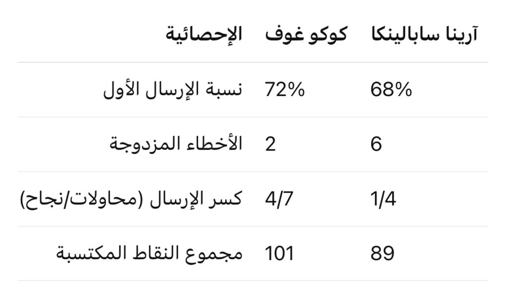 لكن كوكو غوف، المعروفة بسرعة تحركها واتزانها التكتيكي، عادت في المجموعة الثانية بصلابة، مستفيدة من تراجع منافستها بدنيًا وذهنيًا، لتفوز بها 6-4.