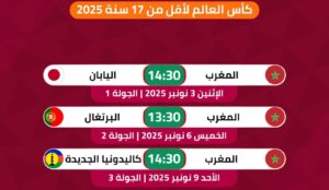تعرف على مواعيد مباريات المنتخب المغربي لأقل من 17 سنة في كأس العالم 2025 بقطر، وتفاصيل المواجهات أمام اليابان والبرتغال وكاليدونيا الجديدة، مع جدول المواعيد الكامل بتوقيت المغرب